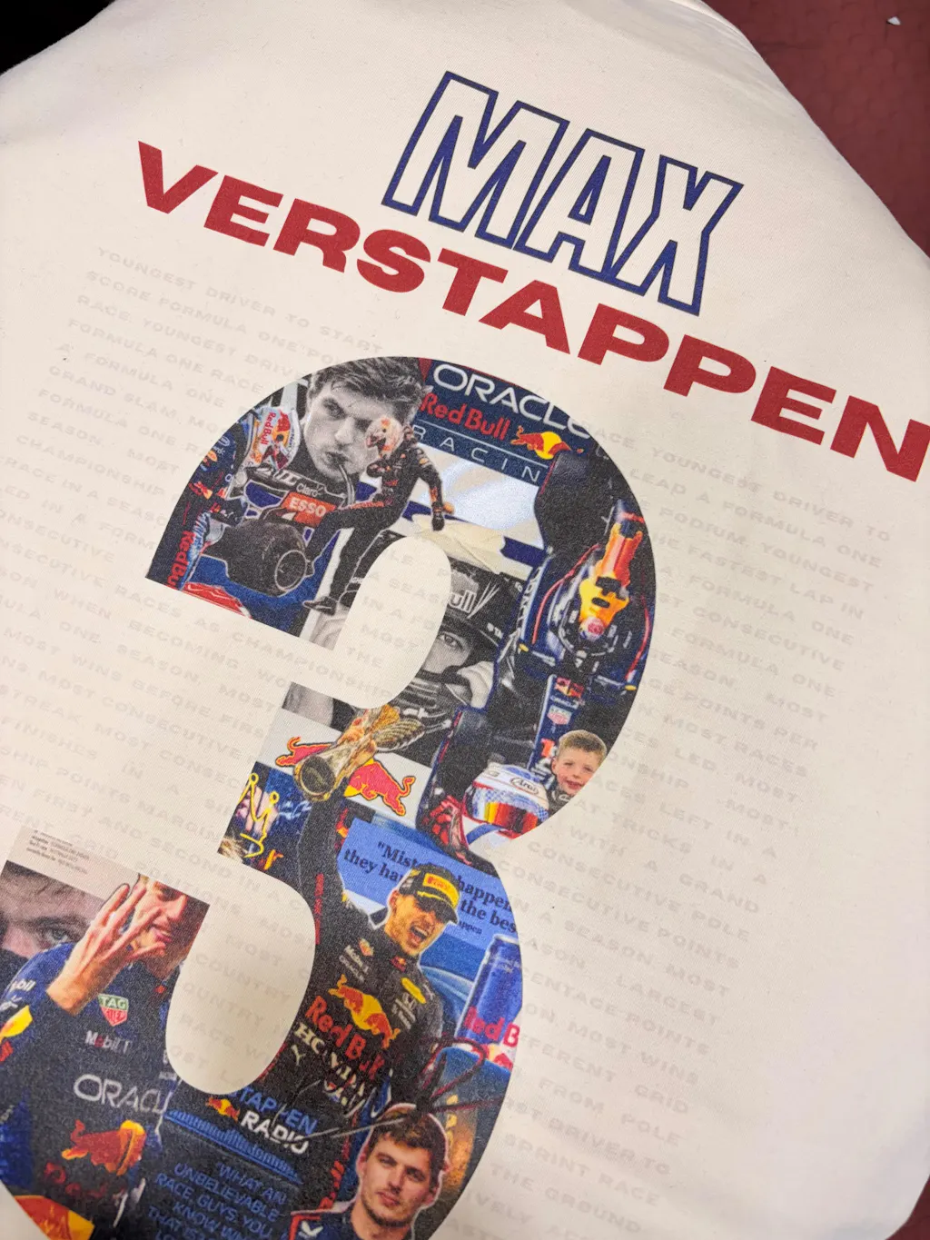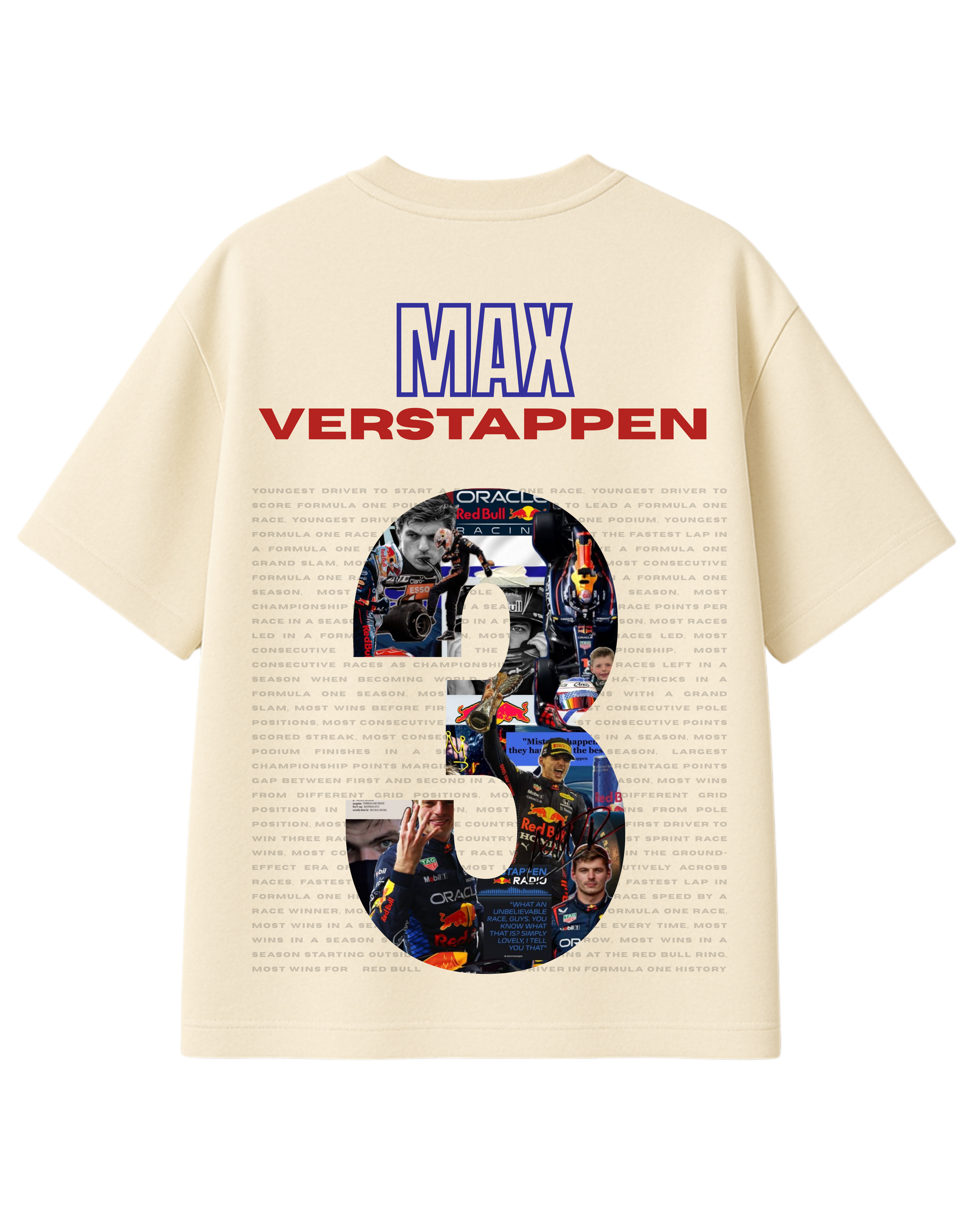 The front features a bold MAX VERSTAPPEN racing typography, creating a clean and powerful look. The back showcases a striking Number 3 graphic collage, filled with iconic moments from Verstappen’s Formula 1 journey — race victories, podium celebrations, and unforgettable performances that cement his place among the sport’s greatest drivers.